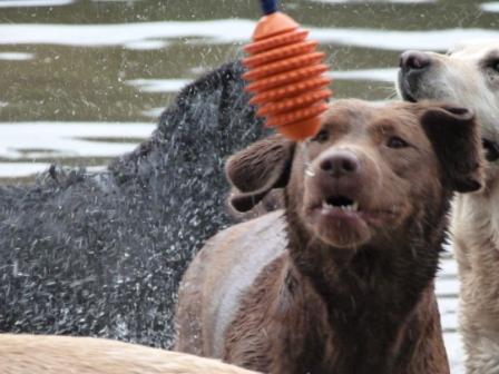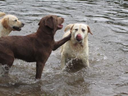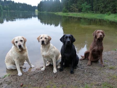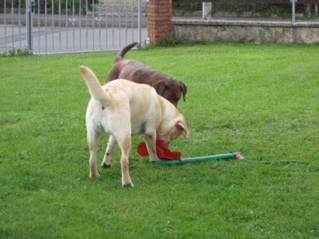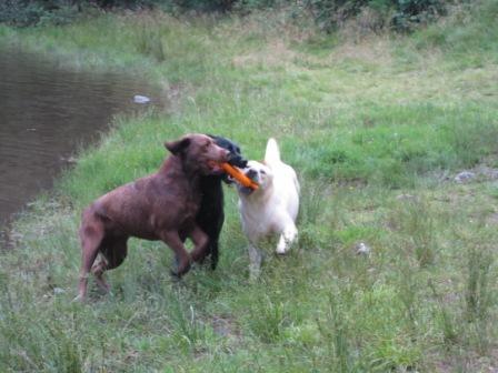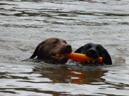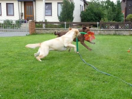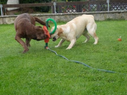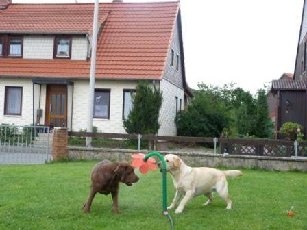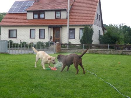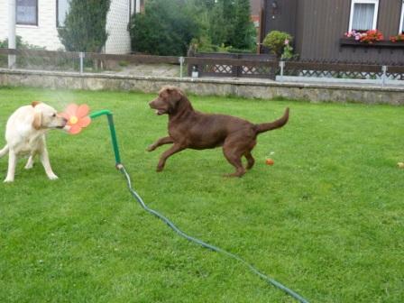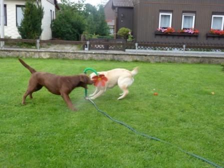 ein Sommer, wie er früher einmal war......Ich glaube, dass wird dieses Jahr nichts mehr. Aber unsere Labis haben auch ohne Sonne spaß. Hauptsache Wasser ist mit im Spiel. Die Blume hat bei Suri und Malou ganze 5 Minuten gehalten
