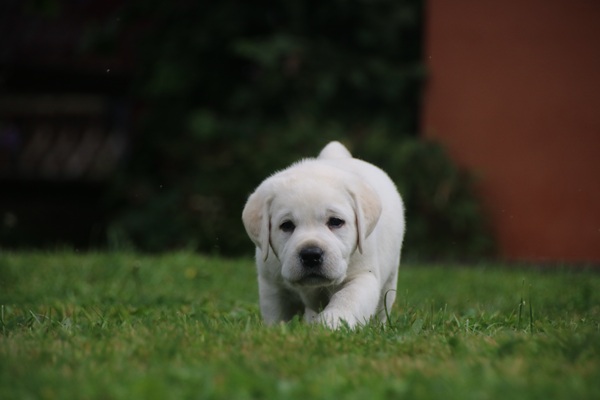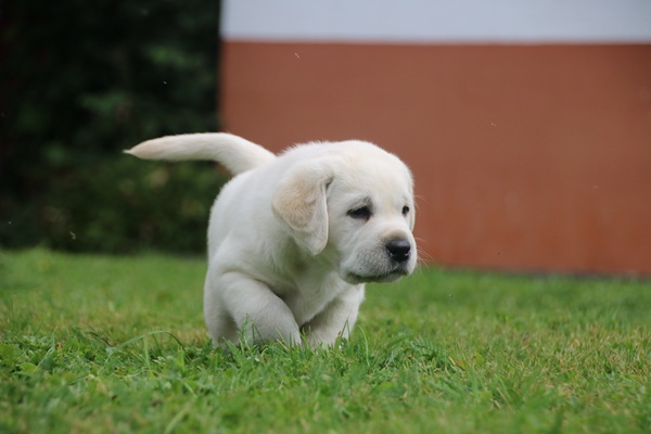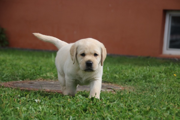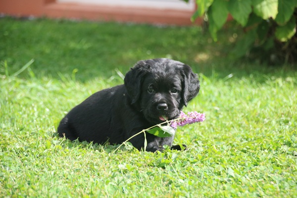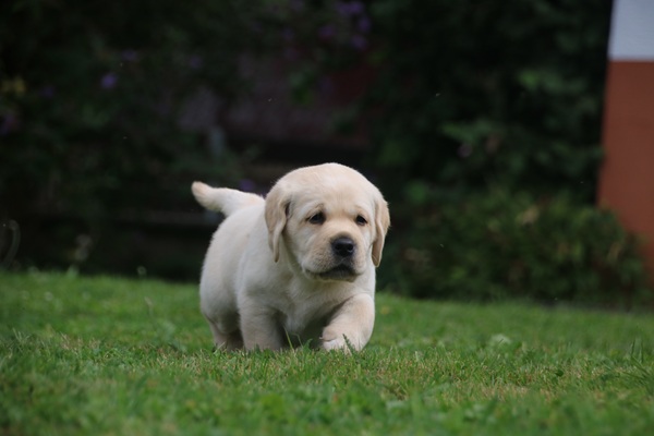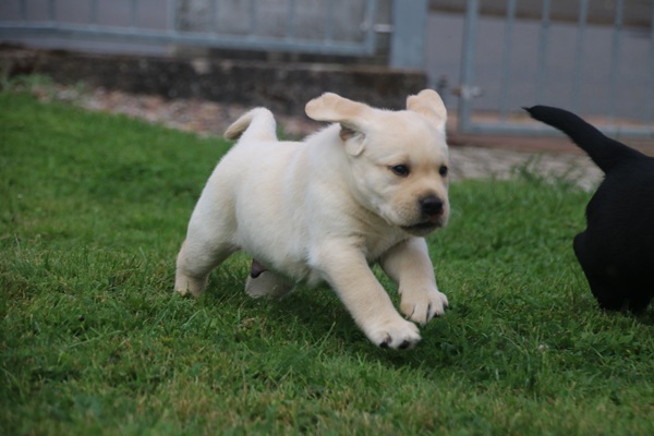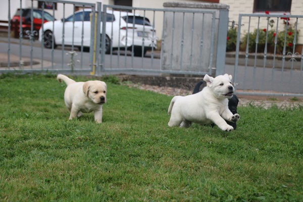 In den letzten drei Wochen haben die Kleinen die "Welt" um die Wurfkiste bereits neugierig und unerschrocken erkundet. Schnell ging es dann auch nach draußen auf die Terasse. Die ersten Sonnenstrahlen wurden aufgesogen und mit der Zeit jede Ecke inspiziert. Unerschrocken und voller Tatendrang ging es auch auf den Rasen und an den heißen sommerlichen Tagen wurde auch neugierig der Wassersprenger unter die Lupe genommen. Ein echter Labbi fühlt sich eben zu seinem Element Wasser hingezogen.